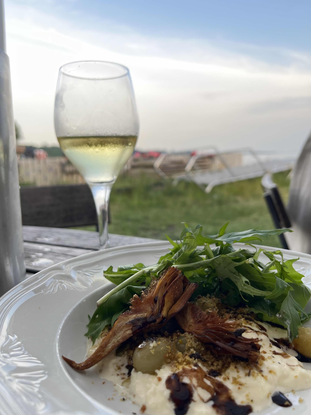 Efter en riktigt varm dag med strålande sol och rekordvärme blev det en enkel middag i hamnkrogen. Dagens höjdare var en av två förrätter nämligen den med frasiga kronärtskockor, brödsmulor, picklade krusbär med stracciatelleost och lite balsamico. Den andra var sotad lax med jalapeños, citronkräm och picklad gurka. Allt sköljdes med med en underbar riesling från Reinhaussen.