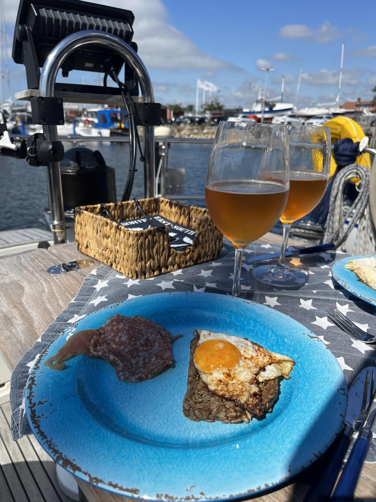 Blev lunch i båten. Lite rester och ett stekt ägg satt fint efter några timmars segling.